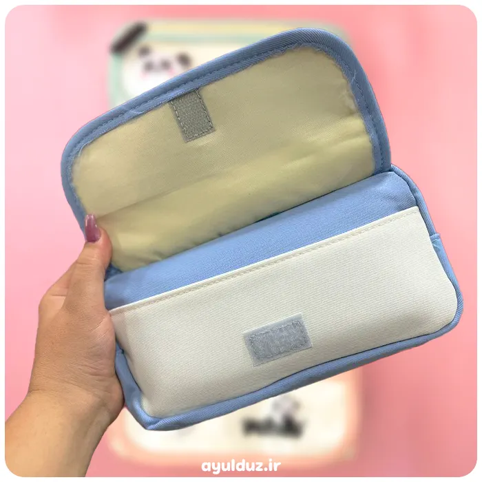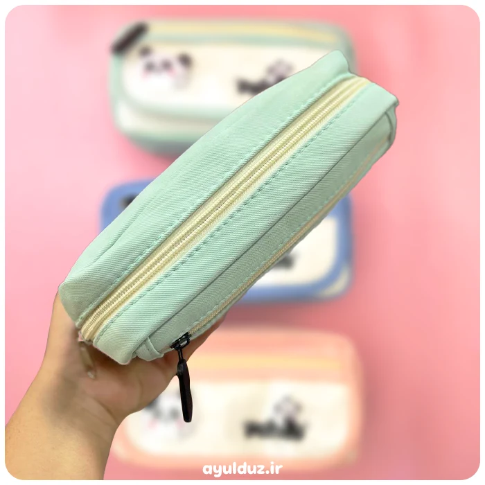 این جامدادی خوشگل جادار در سه رنگبندی آبی، سبز، گلبهی عرضه شده. طرح بسیار کیوتی داره و از جنس پارچه برزنتی درجه یک کار شده. دارای قسمت شفاف و عروسک پشمالو پاندا هستش.