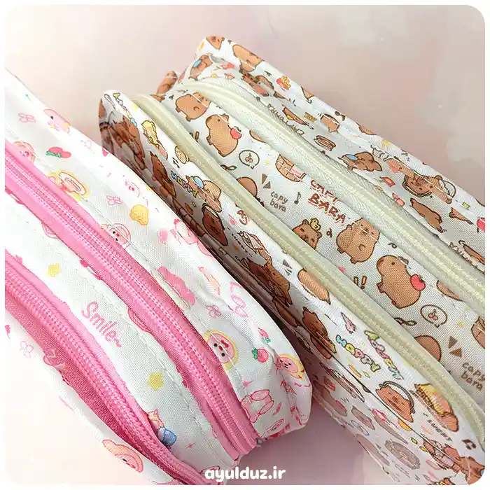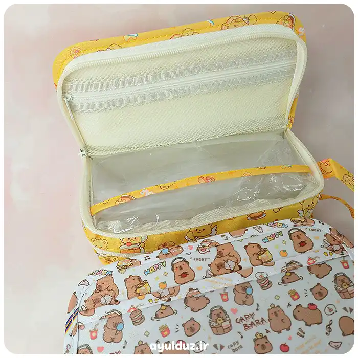 این جامدادی زیبا و جادار از برند معروف موکا در در طرح های خرس صورتی، خرس نارنجی، کاپی بارا عرضه شده. دارای بخش جلویی شفاف و طلقی است و داخل قسمت توری زیپ دار داره. همچنین یک بند کوچک برای آویز کردن داره.